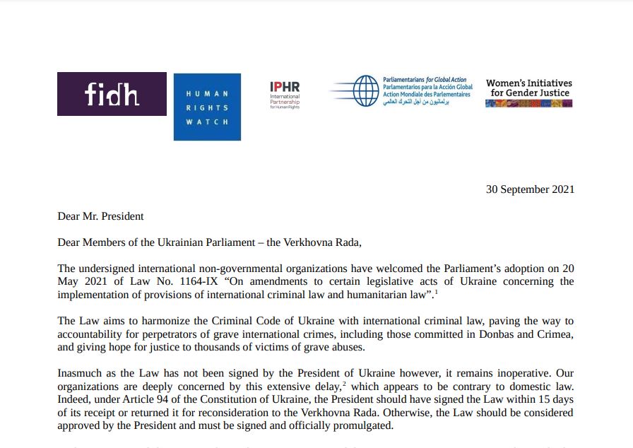 Joint NGO letter urging President of Ukraine to sign international crimes law
