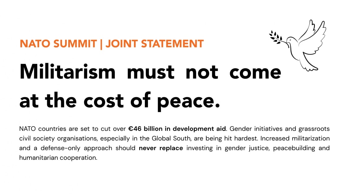 NATO’s proposed doubling or tripling of national defence budgets by 2032 risks undermining global investments in peace and equality. Already this year, NATO member states are expected to collectively cut €46 billion in official development assistance (ODA). These cuts are having a disproportionate impact on gender justice initiatives, women-led peacebuilding, and life-saving civil society efforts, particularly in global majority countries.