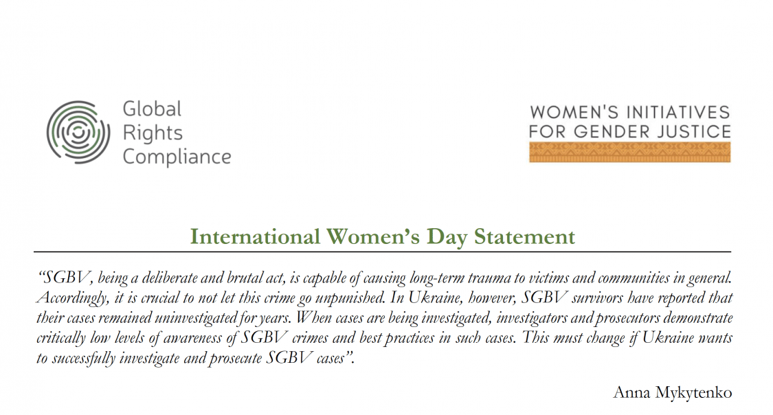 On International Women’s Day 2022, Women’s Initiatives for Gender Justice joins Global Rights Compliance in expressing concern for the real possibility that sexual and gender-based violence (‘SGBV’) will occur within the context of Russia’s most recent invasion of Ukraine and the continuing conflict and refugee crisis. Since the beginning of the conflict in Ukraine in 2014, instances of SGBV have been recorded by human rights activists, and the number is likely to increase. GRC and WIGJ urge the international community to centre the voices of women and girls in their response to the current crisis; ensure the recognition and contemporaneous documentation of all types of SGBV in line with international best practices on the collection of evidence; and pursue all available avenues for accountability of such crimes.